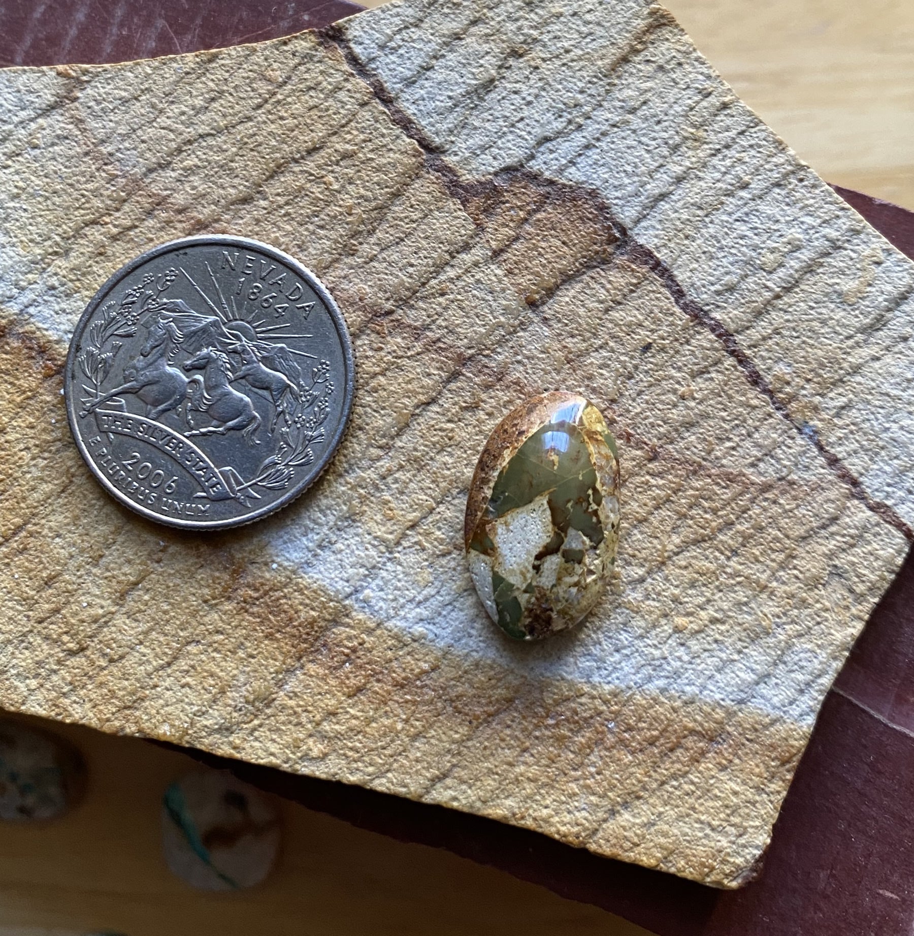 Description: A turquoise vein stone discovered at Stone Mountain Mine fashioned into a green boulder-cut Stone Mountain Turquoise cabochon.