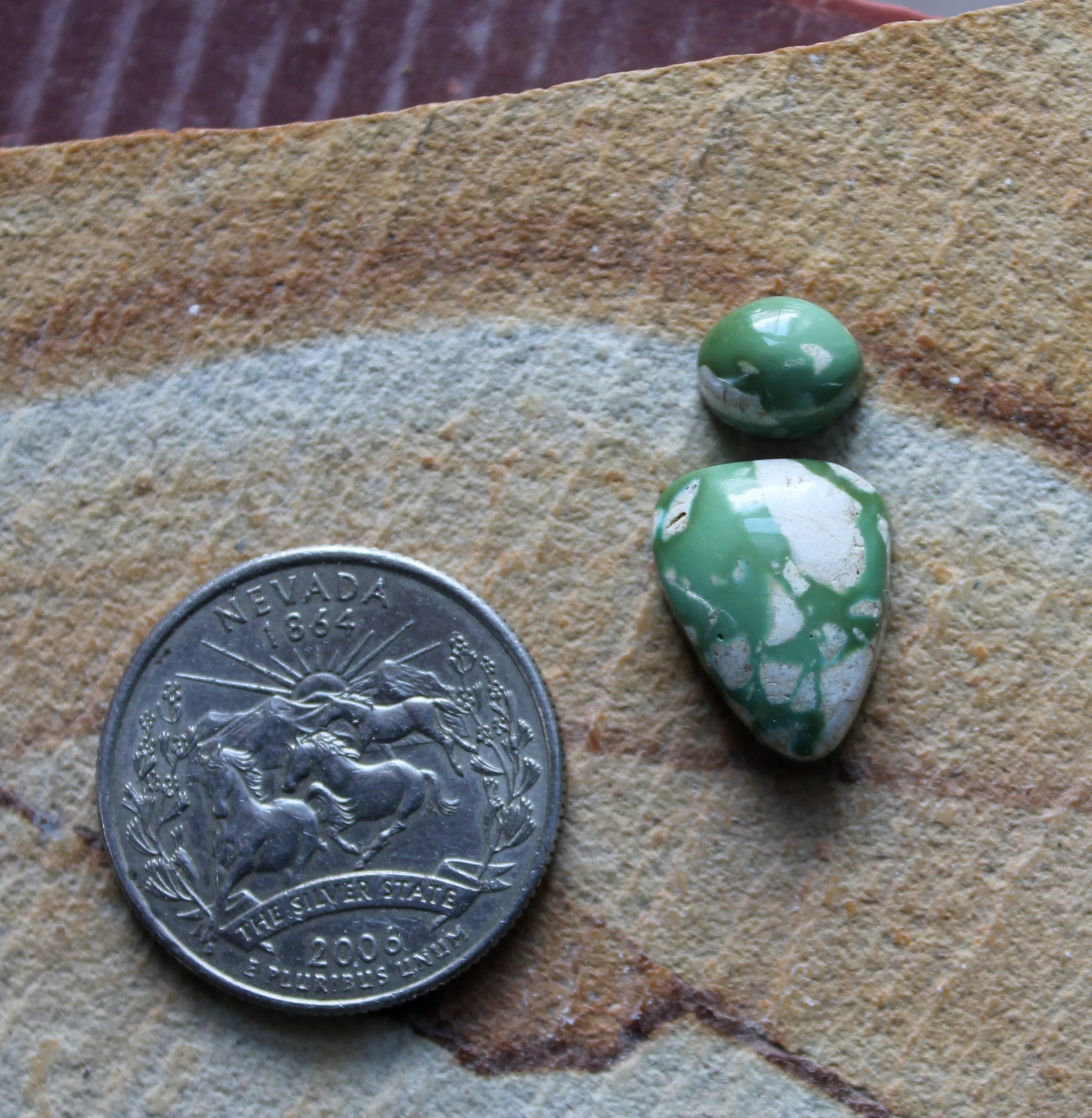 Description: Two turquoise vein stones from Stone Mountain Mine fashioned into a two green turquoise cabochons.