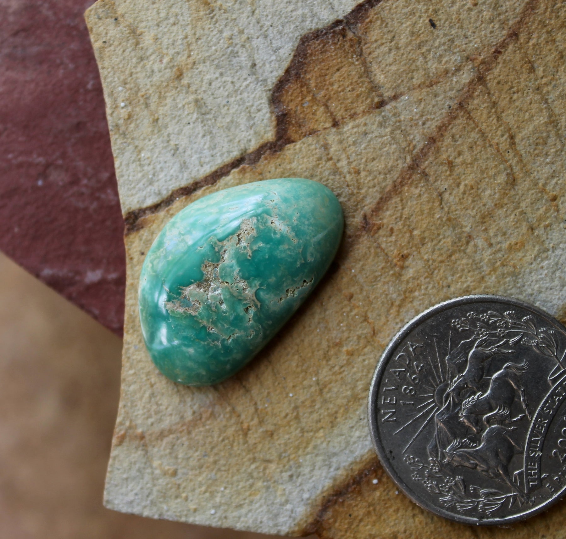 Description: A large turquoise vein nugget discovered at Stone Mountain Mine fashioned into a sea green turquoise cabochon.
