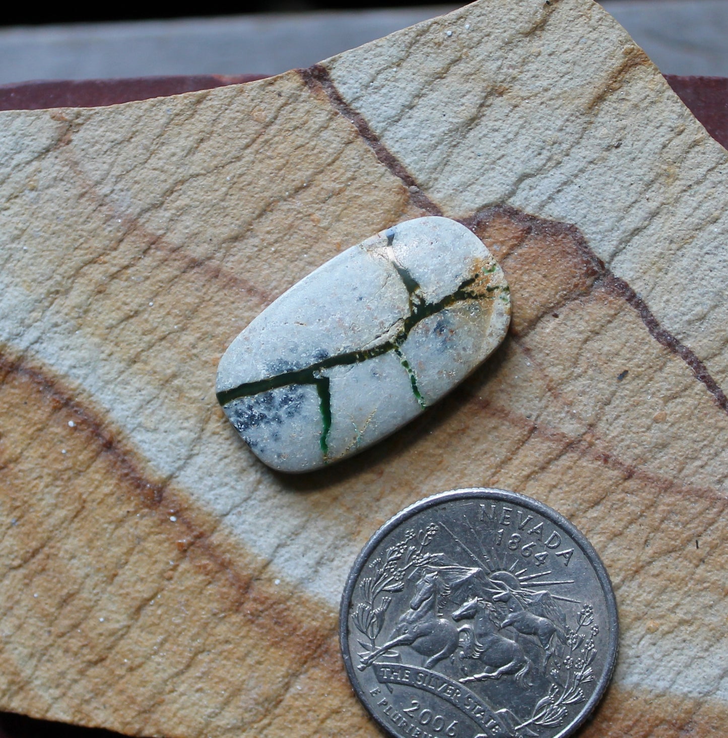 Description: A turquoise vein segment from Stone Mountain Mine fashioned into a green boulder-cut turquoise cabochon. This turquoise cabochon is untreated.
