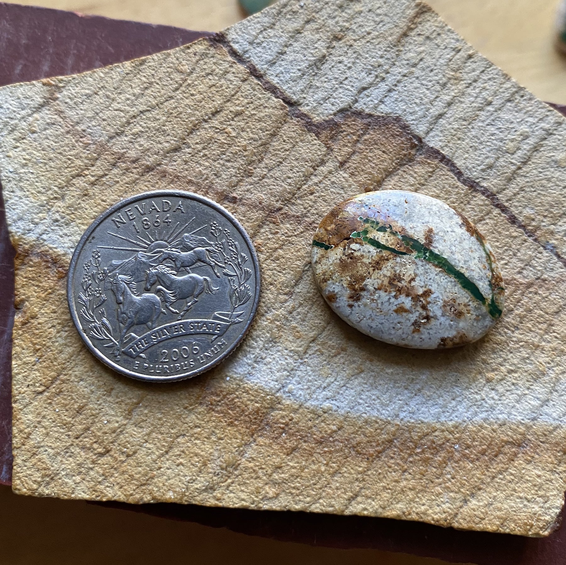 Description: A turquoise vein stone found at Stone Mountain Mine fashioned into a boulder-cut Stone Mountain Turquoise cabochon.
