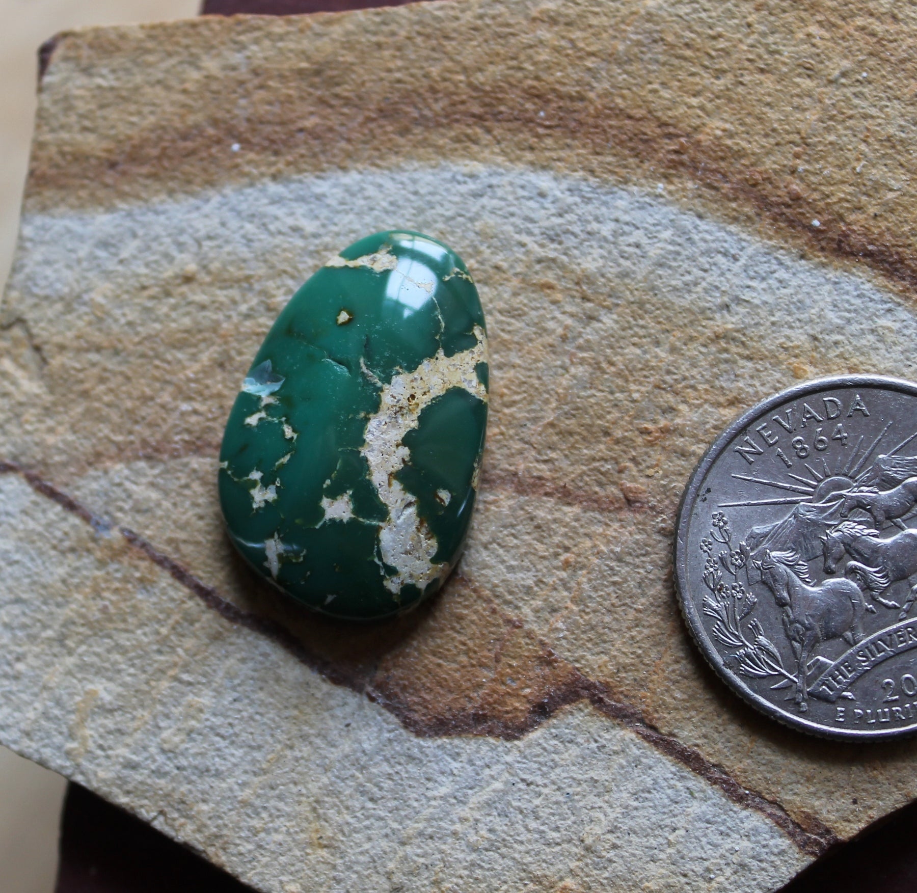 Description: A turquoise vein nugget found at Stone Mountain Mine fashioned into a forest green turquoise cabochon with a high dome. This cabochon is untreated and un-backed.