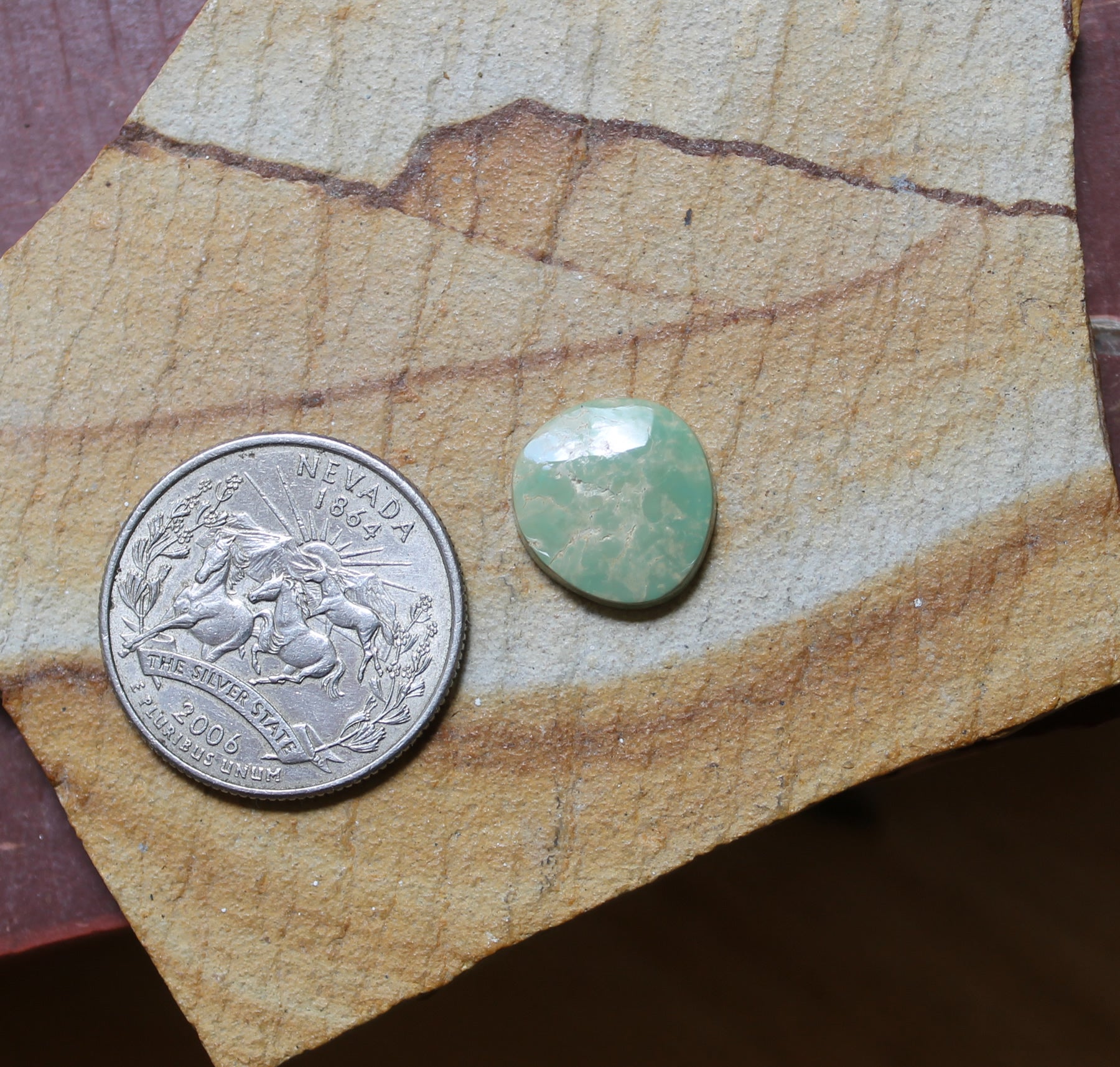 Description: A turquoise vein stone found at Stone Mountain Mine fashioned into a green turquoise cabochon.