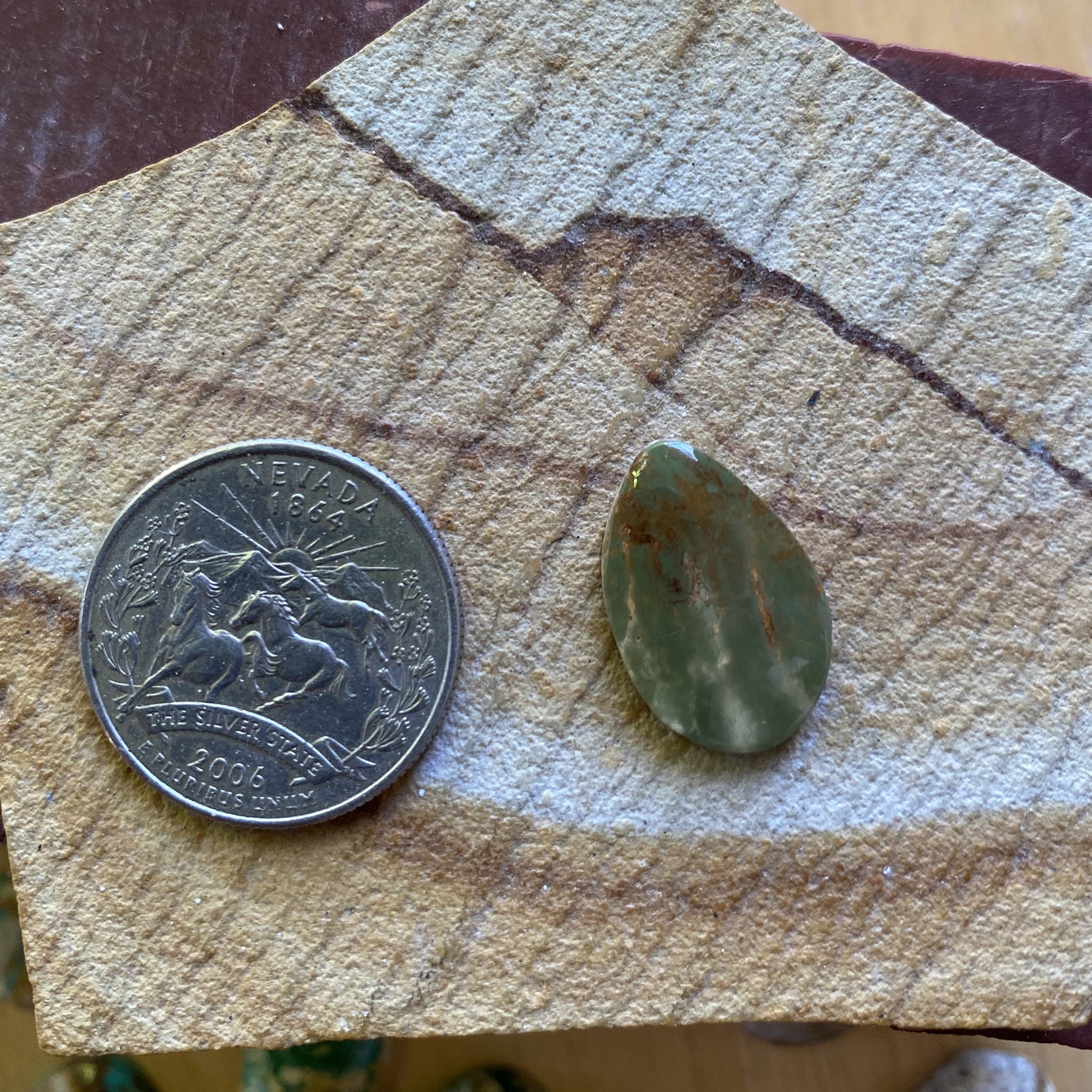 Description: A turquoise vein nugget discovered at Stone Mountain Mine fashioned into a green Stone Mountain Turquoise cabochon.