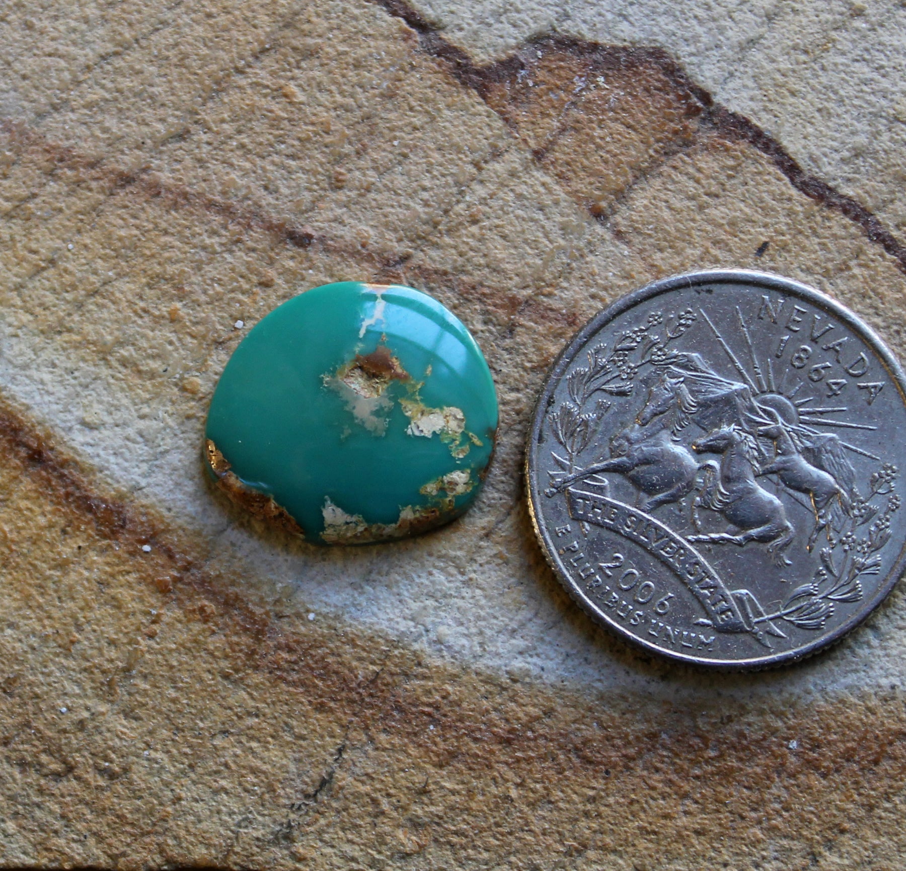Description: A turquoise vein stone found at Stone Mountain Mine fashioned into a green teal turquoise cabochon.