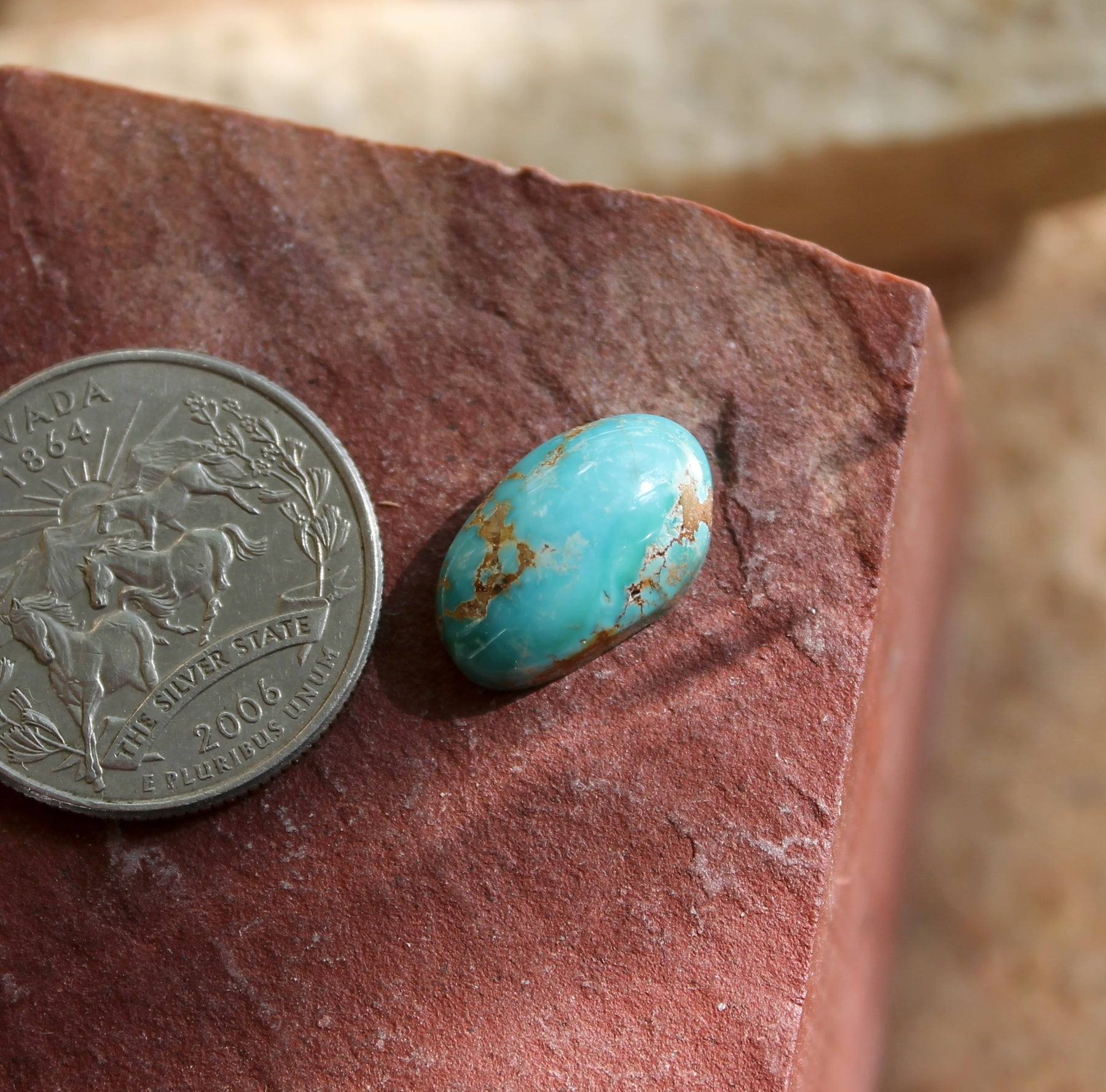 Description: A turquoise nugget from at Stone Mountain Mine fashioned into a blue turquoise cabochon with a high dome. All the turquoise we sell is untreated.