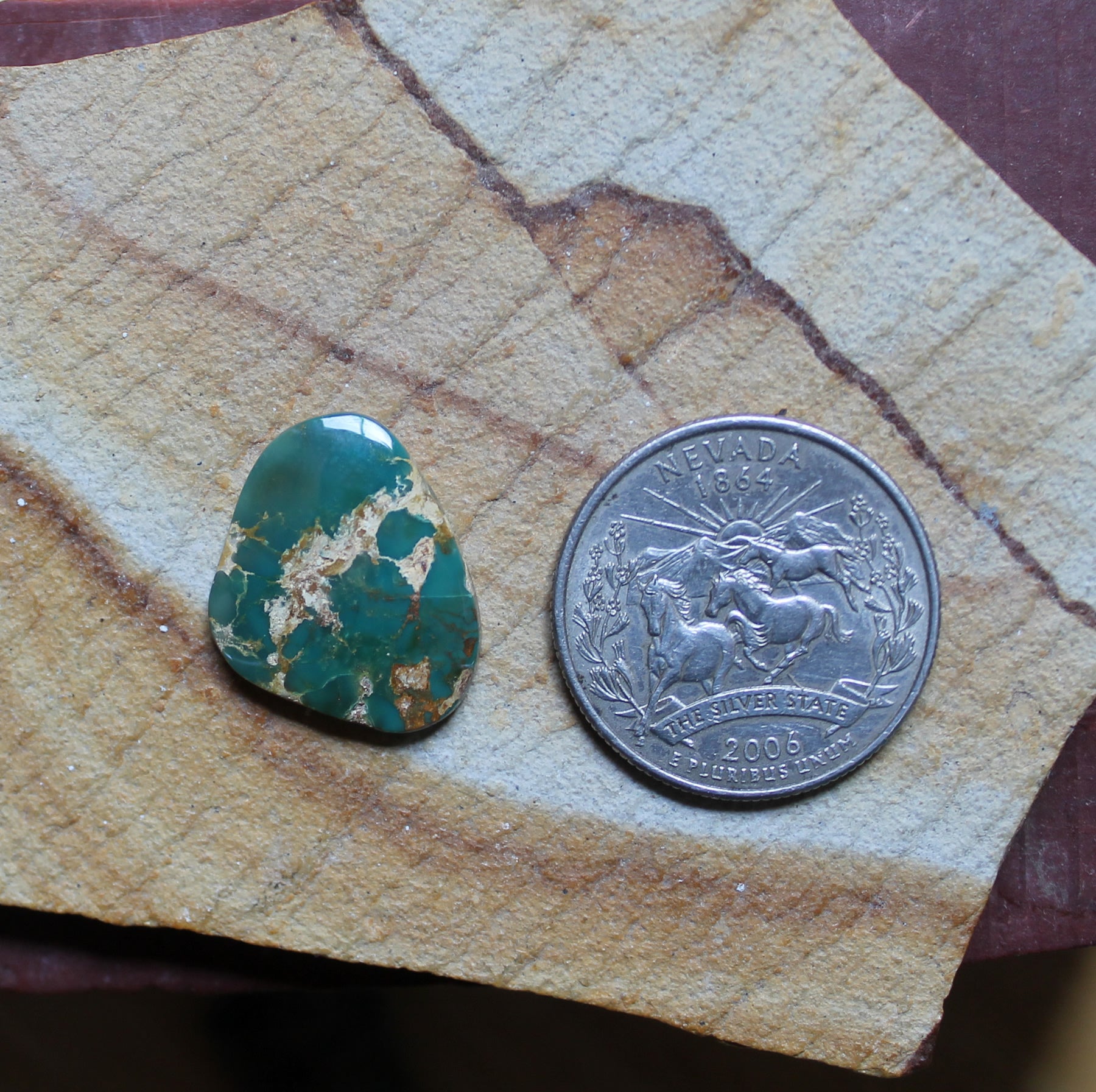 Description: A turquoise vein stone discovered at Stone Mountain Mine fashioned into a dark green turquoise cabochon.