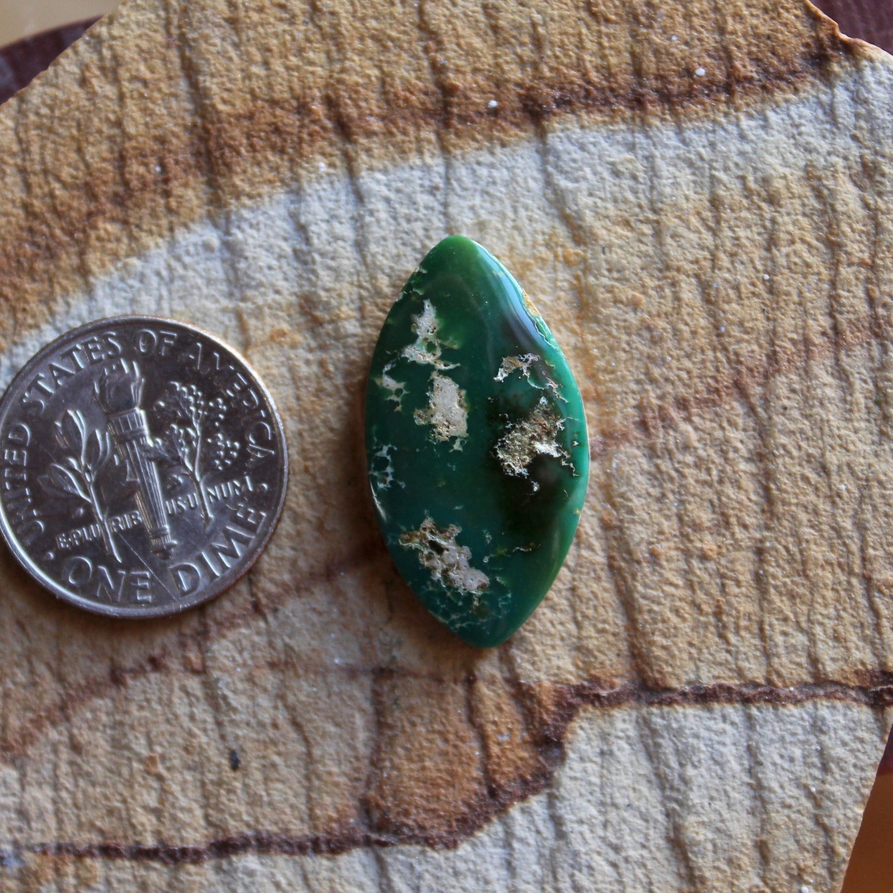 Description: A turquoise vein stone found at Stone Mountain Mine fashioned into a deep green turquoise cabochon. This untreated turquoise cabochon is cut with hostrock backing.